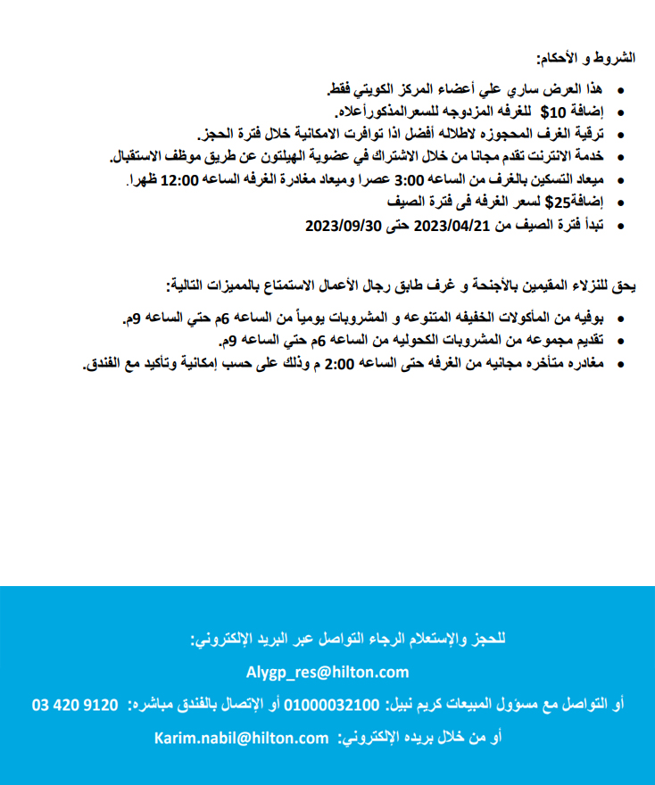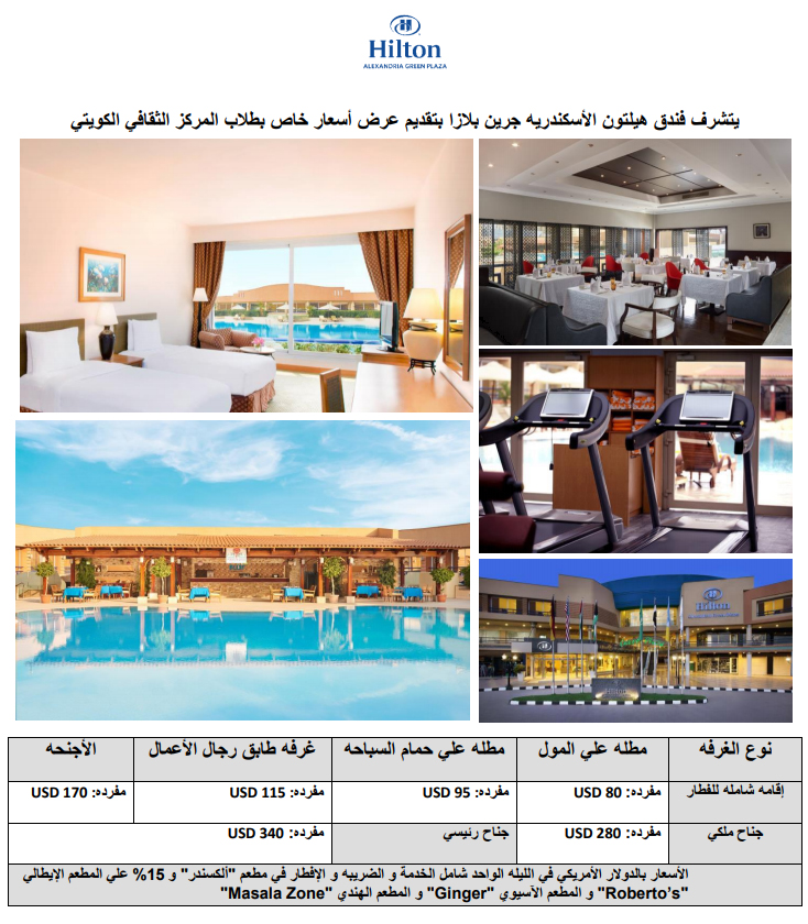 يتشرف فندق هيلتون الأسكندرية جرين بلازا بتقديم عرض أسعار خاص بطلاب المركز الثقافى الكويتى
