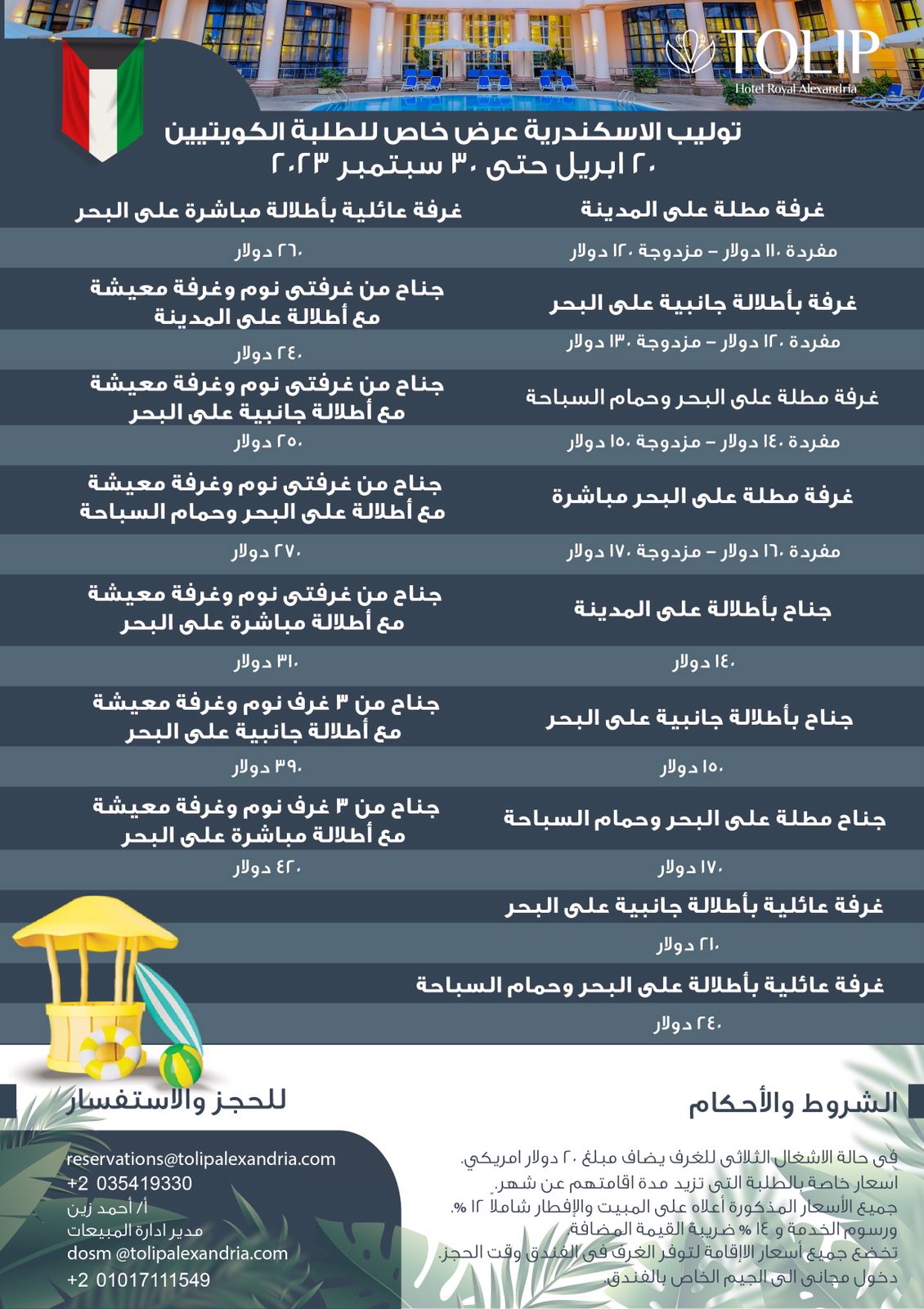 يتشرف فندق توليب الأسكندرية بتقديم عرض أسعار خاص للطلاب الكويتيين من 20 إبريل حتى 30 سبتمبر 2023
